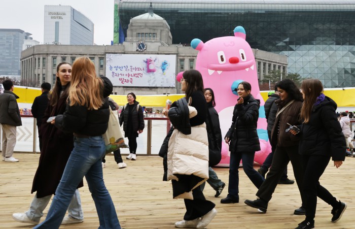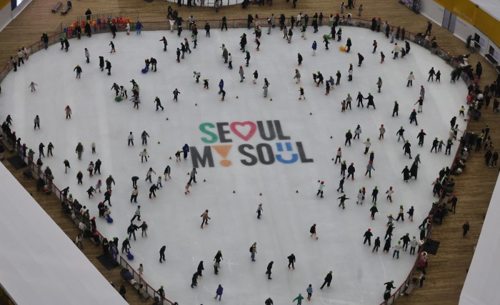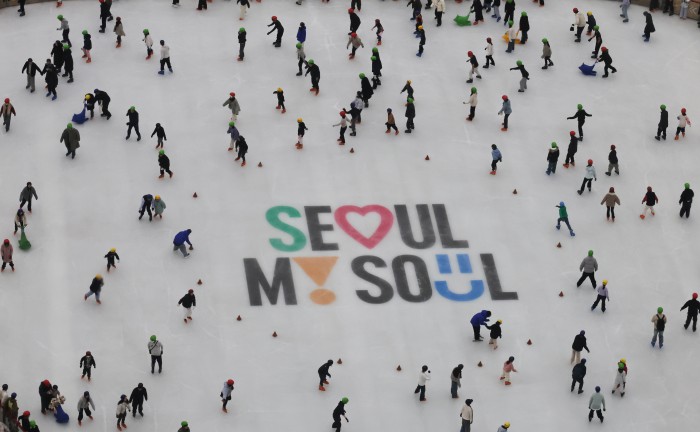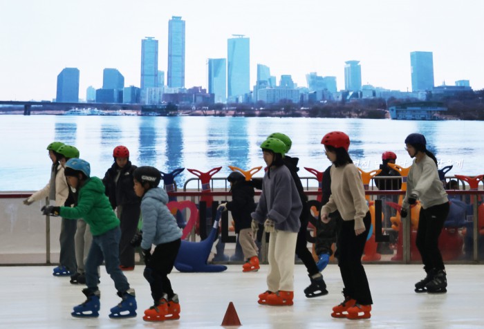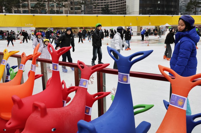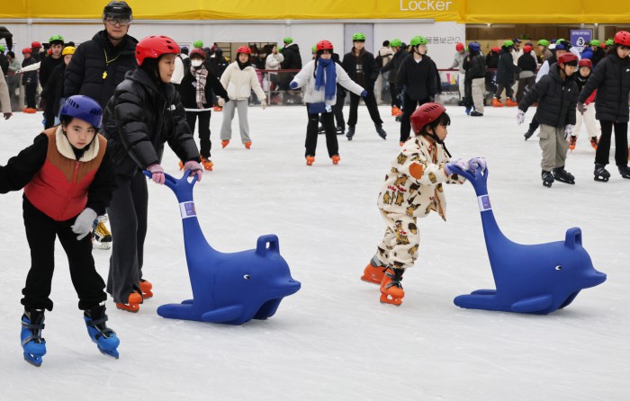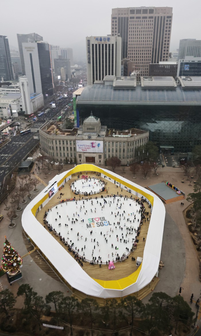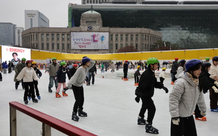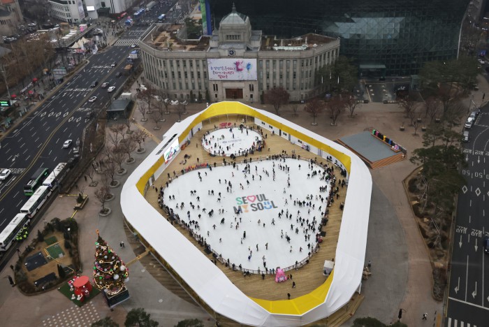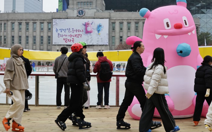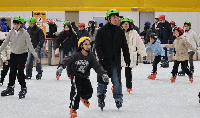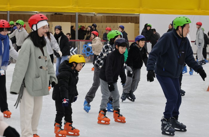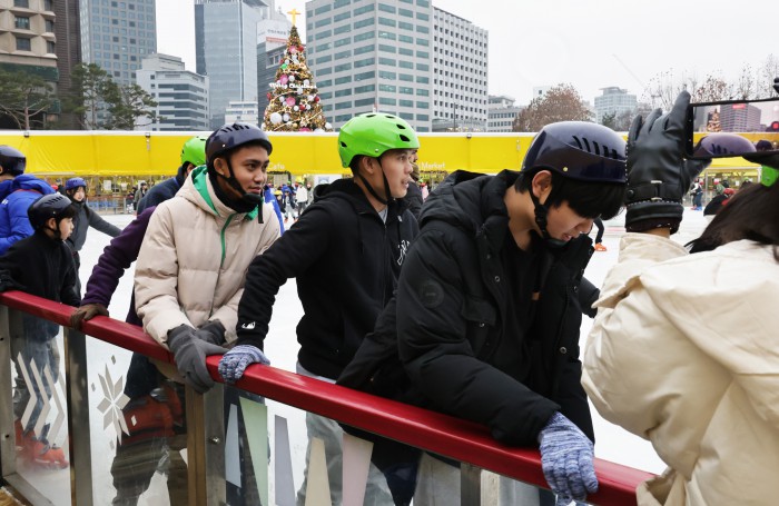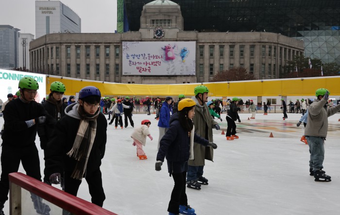 [서울=뉴스핌] 양윤모 기자 = 20일 휴일을 맞아 서울의 낮 기온이 11도를 나타내며 포근한 가운데, 서울 중구 서울광장 스케이트장에서 시민들과 관광객들이 스케이트를 즐기고 있다. 서울광장 스케이트장은 1시간에 1000원으로 헬멧과 스케이트 대여료가 포함된 가격으로 2월 8일까지 이용할수 있다. 2025.12.20 yym58@newspim.com