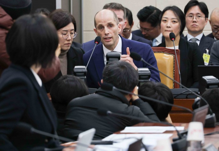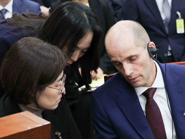 [서울=뉴스핌] 윤창빈 기자 = 해롤드 로저스 쿠팡 임시 대표가 30일 서울 여의도 국회 과학기술정보방송통신위원회 전체회의에서 열린쿠팡 침해사고 및 개인정보 유출, 불공정 거래, 노동환경 실태 파악과 재발방지 대책 마련을 위한 청문회에서 관계자들과 대화하고 있다. 2025.12.30 pangbin@newspim.com