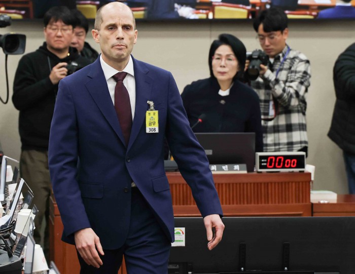 [서울=뉴스핌] 윤창빈 기자 = 해롤드 로저스 쿠팡 임시 대표가 30일 서울 여의도 국회 과학기술정보방송통신위원회 전체회의에서 열린쿠팡 침해사고 및 개인정보 유출, 불공정 거래, 노동환경 실태 파악과 재발방지 대책 마련을 위한 청문회에서 최민희 위원장에게 선서문을 전달하고 자리로 돌아서고 있다. 2025.12.30 pangbin@newspim.com