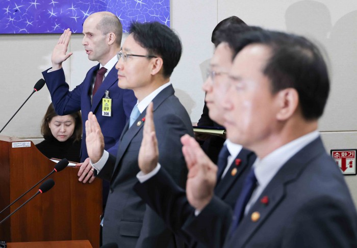 [서울=뉴스핌] 윤창빈 기자 = 해롤드 로저스 쿠팡 임시 대표가 30일 서울 여의도 국회 과학기술정보방송통신위원회 전체회의에서 열린쿠팡 침해사고 및 개인정보 유출, 불공정 거래, 노동환경 실태 파악과 재발방지 대책 마련을 위한 청문회에서 선서를 하고 있다. 2025.12.30 pangbin@newspim.com