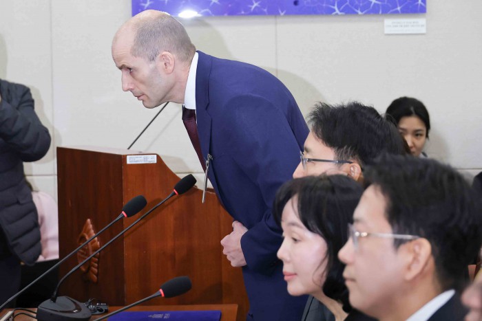 [서울=뉴스핌] 윤창빈 기자 = 해롤드 로저스 쿠팡 임시 대표가 30일 서울 여의도 국회 과학기술정보방송통신위원회 전체회의에서 열린쿠팡 침해사고 및 개인정보 유출, 불공정 거래, 노동환경 실태 파악과 재발방지 대책 마련을 위한 청문회에서 인사를 하고 있다. 2025.12.30 pangbin@newspim.com