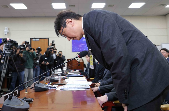 [서울=뉴스핌] 윤창빈 기자 = 박대준 쿠팡 전 대표이사가 30일 서울 여의도 국회 과학기술정보방송통신위원회 전체회의에서 열린쿠팡 침해사고 및 개인정보 유출, 불공정 거래, 노동환경 실태 파악과 재발방지 대책 마련을 위한 청문회에서 인사를 하고 있다. 2025.12.30 pangbin@newspim.com