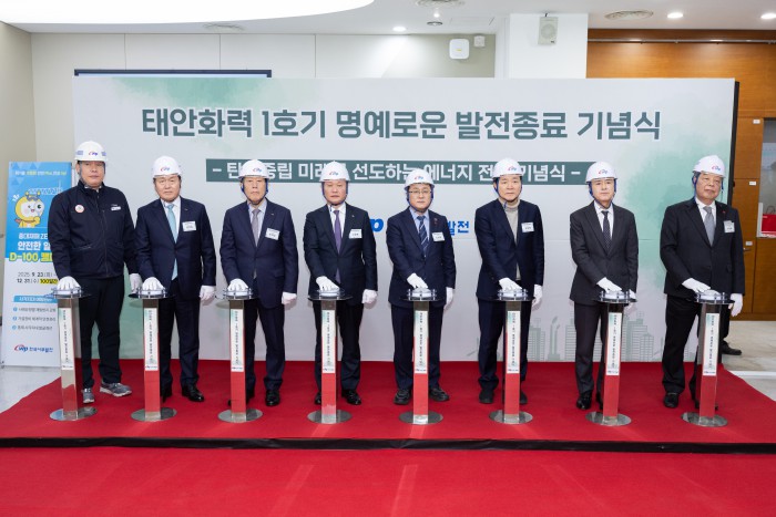 [서울=뉴스핌] 김성환 기후에너지환경부 장관이 31일 충남 태안군 소재 한국서부발전본부에서 열린 태안석탄화력발전소 1호기 발전종료 행사에 참석해 내빈과 함께 발전종료 스위치를 누르는 세리머니를 하고 있다. [사진=기후에너지환경부] 2025.12.31 photo@newspim.com