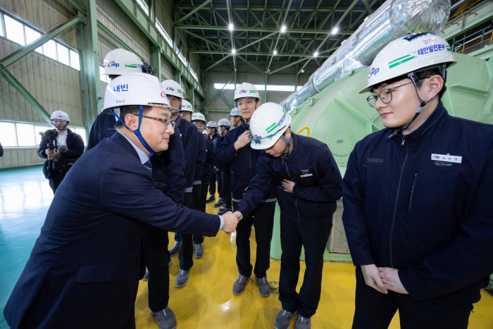 [서울=뉴스핌] 김성환 기후에너지환경부 장관이 31일 충남 태안군 소재 한국서부발전본부에서 열린 태안석탄화력발전소 1호기 발전종료 행사를 마치고 근무 직원들을 격려하고 있다. [사진=기후에너지환경부] 2025.12.31 photo@newspim.com