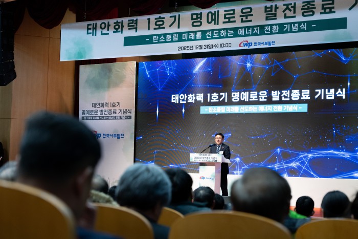 [서울=뉴스핌] 김성환 기후에너지환경부 장관이 31일 충남 태안군 소재 한국서부발전본부에서 열린 태안석탄화력발전소 1호기 발전종료 행사에 참석해 축사를 하고 있다. [사진=기후에너지환경부] 2025.12.31 photo@newspim.com