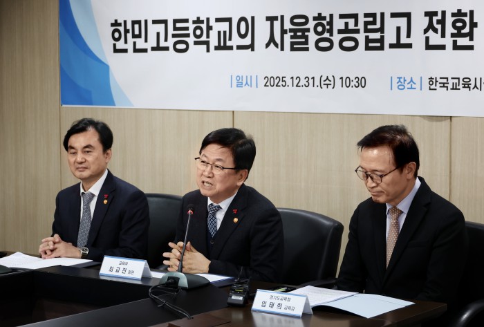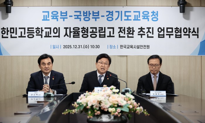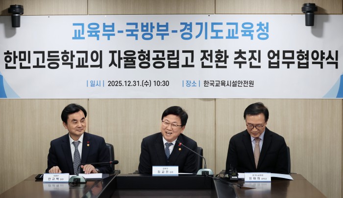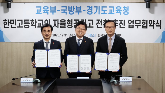 [서울=뉴스핌] 최교진 교육부(가운데)·안규백 국방부 장관(왼쪽), 임태희 경기도교육청 교육감이 31일 서울 여의도 한국교육시설안전원에서 열린 한민고등학교의 자율형공립고 전환 추진 업무협약식에서 협약서를 들고 기념촬영을 하고 있다. [사진=기후에너지환경부] 2025.12.31 photo@newspim.com