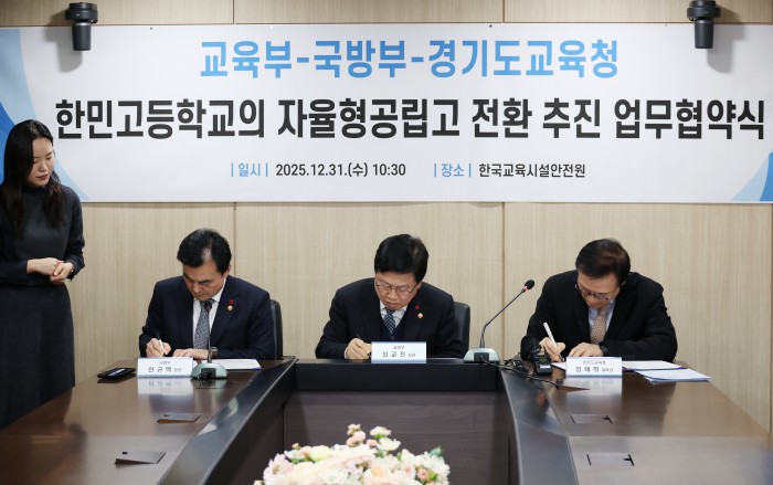 [서울=뉴스핌] 최교진 교육부(가운데)·안규백 국방부 장관(왼쪽), 임태희 경기도교육청 교육감이 31일 서울 여의도 한국교육시설안전원에서 열린 한민고등학교의 자율형공립고 전환 추진 업무협약식에서 협약서에 서명을 하고 있다. [사진=기후에너지환경부] 2025.12.31 photo@newspim.com