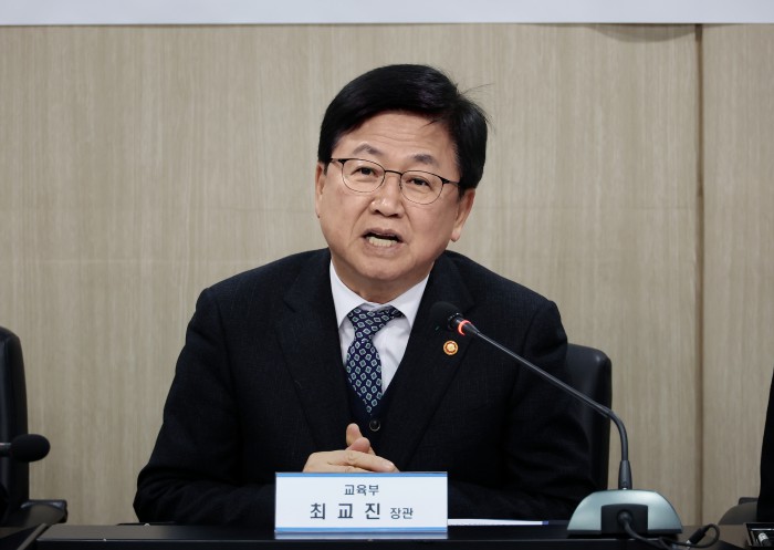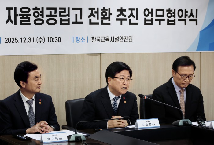 [서울=뉴스핌] 최교진 교육부 장관이 31일 서울 여의도 한국교육시설안전원에서 열린 한민고등학교의 자율형공립고 전환 추진 업무협약식에서 인사말을 하고 있다. [사진=기후에너지환경부] 2025.12.31 photo@newspim.com