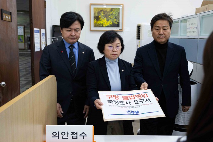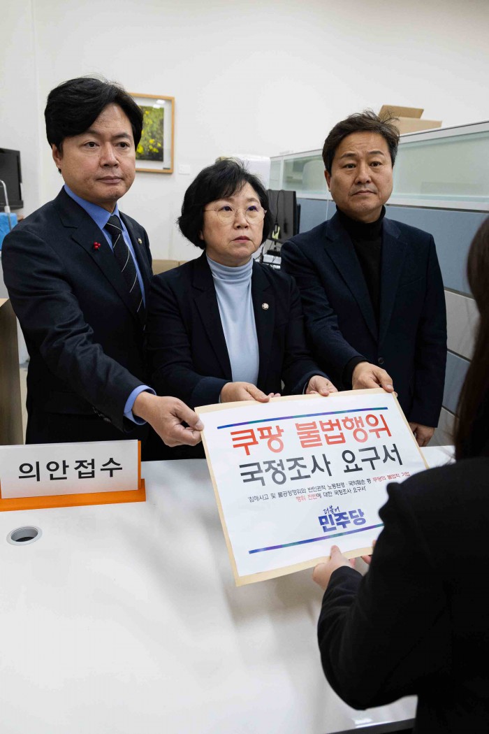 [서울=뉴스핌] 윤창빈 기자 = 국회 과학기술정보방송통신위원회 김현 더불어민주당 간사(가운데)와, 김영배 외교통일위원회 간사(오른쪽), 김현정 원내대변인이 31일 서울 여의도 국회 의안과에 쿠팡 불법행위 국정조사 요구서를 제출하고 있다. 2025.12.31 pangbin@newspim.com