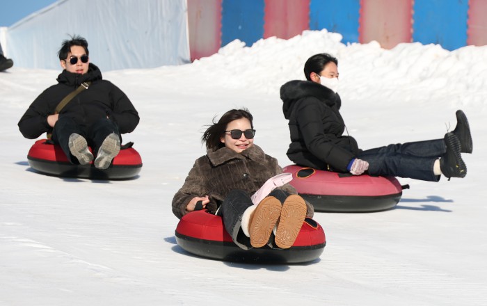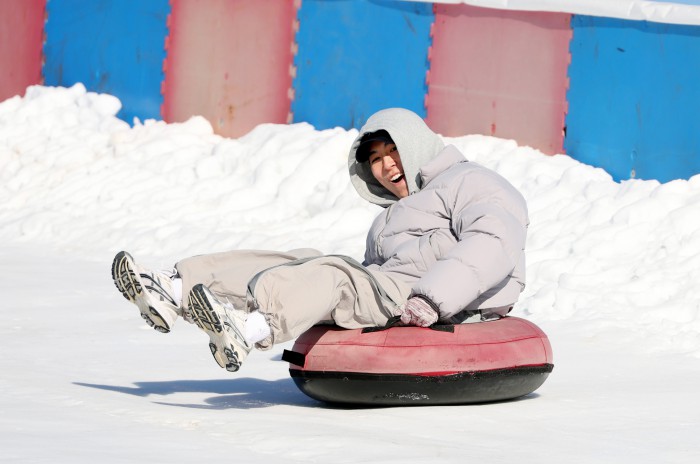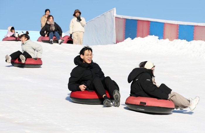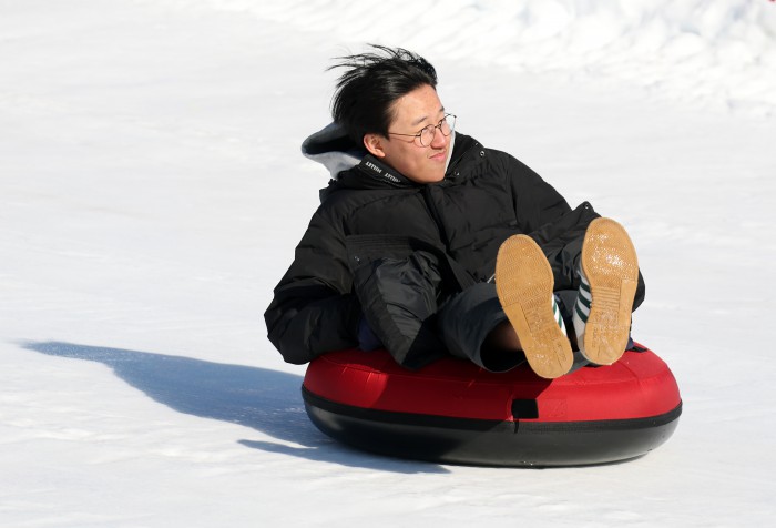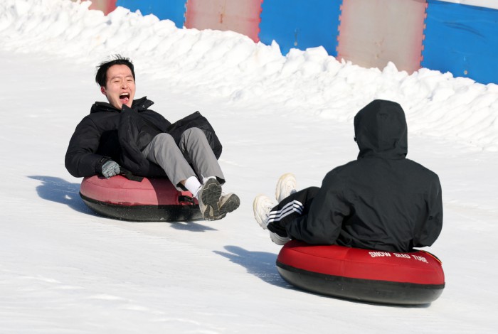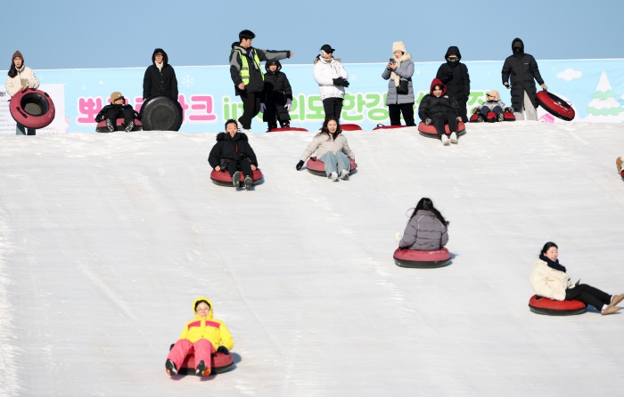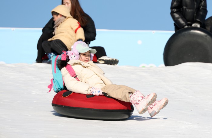 [서울=뉴스핌] 정일구 기자 = 31일 오후 서울 영등포구 여의도한강공원 눈썰매장을 찾은 시민들이 눈썰매를 즐기고 있다. 이날 개장한 뚝섬·잠원·여의도한강공원 눈썰매장은 내년 2월 18일까지 운영된다. 2025.12.31 mironj19@newspim.com