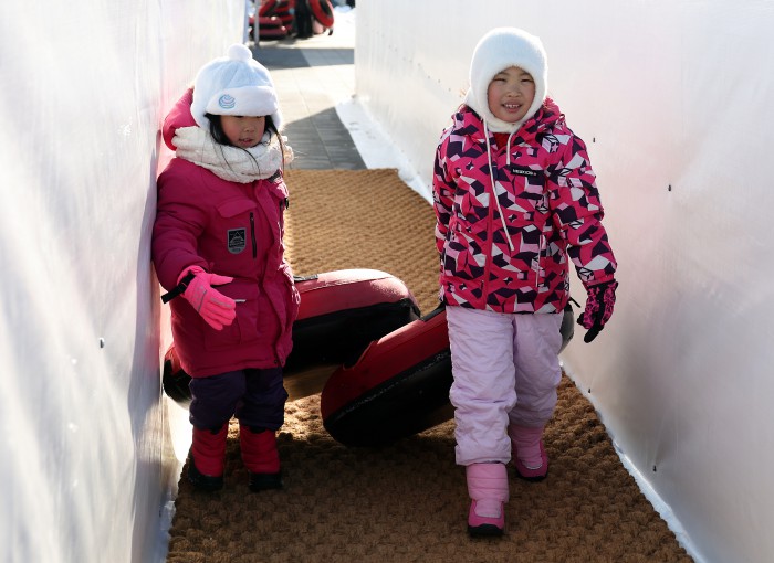 [서울=뉴스핌] 정일구 기자 = 31일 오후 서울 영등포구 여의도한강공원 눈썰매장을 찾은 어린이들이 눈썰매를 타기 위해 이동하고 있다. 이날 개장한 뚝섬·잠원·여의도한강공원 눈썰매장은 내년 2월 18일까지 운영된다. 2025.12.31 mironj19@newspim.com
