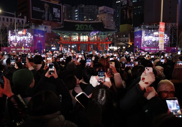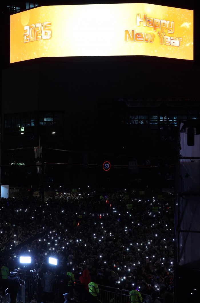 [서울=뉴스핌] 정일구 기자 = 31일 오후 서울 종로구 보신각에서 열린 2025 제야의 종 타종행사에서 시민들이 새해를 앞두고 카운트다운을 하고 있다. 2026.01.01 mironj19@newspim.com