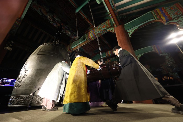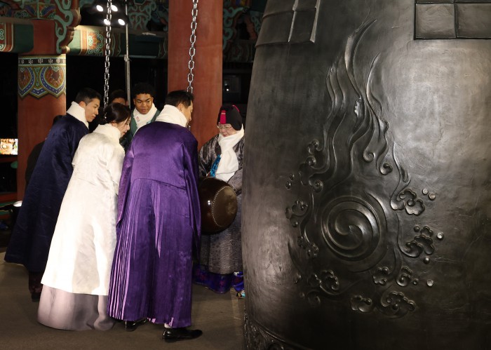 [서울=뉴스핌] 정일구 기자 = 병오년(丙午年) 새해 첫날인 1일 오전 서울 종로구 보신각에서 정근식 서울시교육감과 시민대표들이 2025 제야의 종 타종행사에서 타종을 하고 있다. 2026.01.01 mironj19@newspim.com