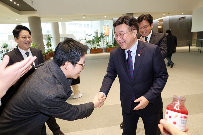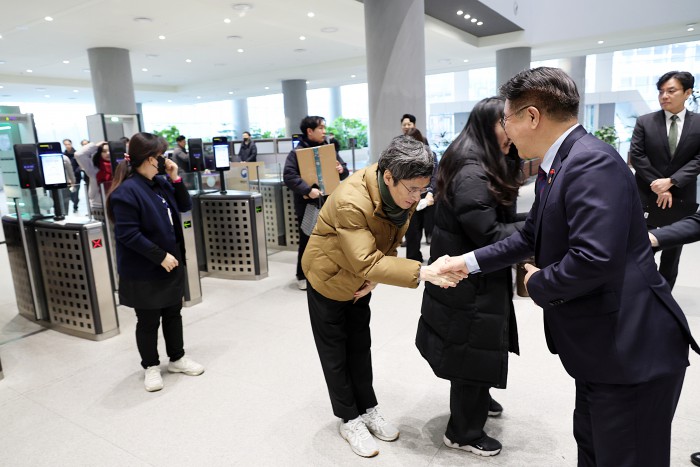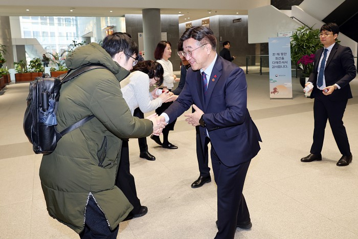 [서울=뉴스핌] 윤호중 행정안전부 장관이 5일 오전 정부세종청사 중앙동 로비에서 출근하는 직원들과 새해 인사 악수하고 있다. [사진=행정안전부] 2026.01.05 photo@newspim.com