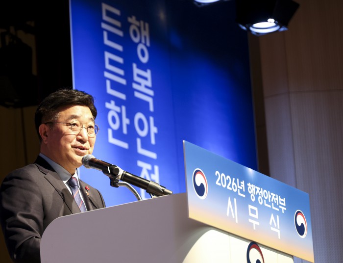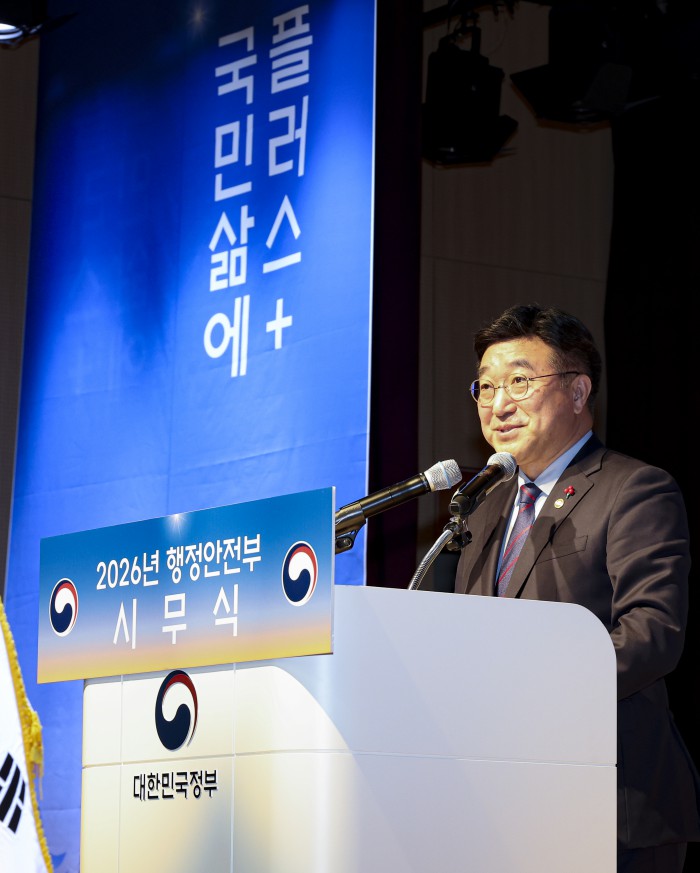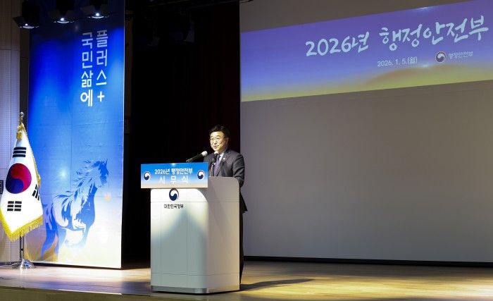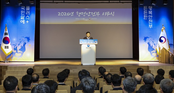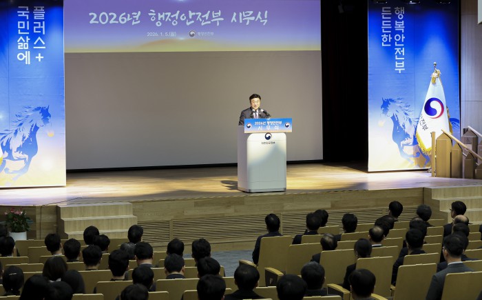 [서울=뉴스핌] 윤호중 행정안전부 장관이 5일 오전 정부세종청사 중앙동 대강당에서 열린 2026년도 행정안전부 시무식에서 신년 인사말을 하고 있다. [사진=행정안전부] 2026.01.05 photo@newspim.com