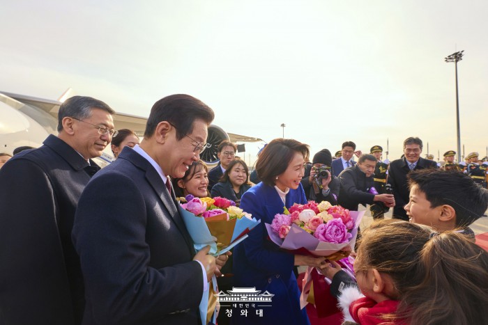 [서울=뉴스핌] 이재명 대통령과 김혜경 여사가 지난 4일 중국 베이징 서우두 공항에 도착해 아이들에게 환영의 꽃다발을 받고 있다. [사진=대통령실] 2026.01.05 photo@newspim.com