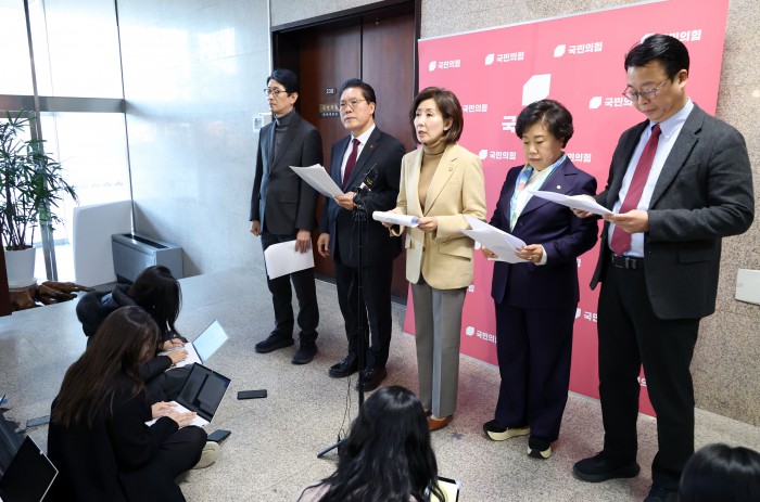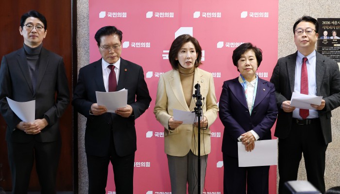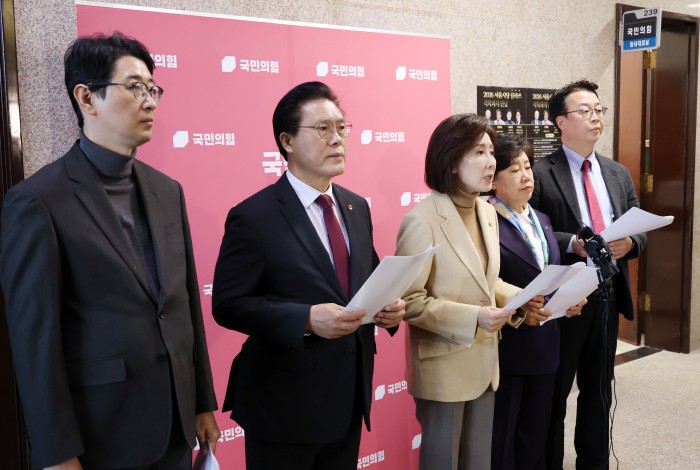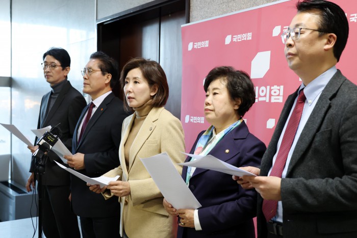 [서울=뉴스핌] 정일구 기자 = 국민의힘 나경원 의원을 비롯한 국민의힘 법제사법위원회 소속 의원들이 5일 오후 서울 여의도 국회에서 민주당의 일방적 법사위 회의 취소 통보를 규탄 기자회견을 하고 있다. 2026.01.05 mironj19@newspim.com
