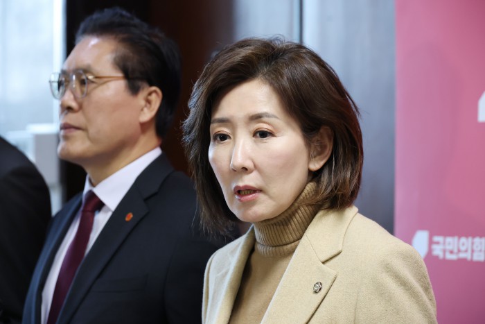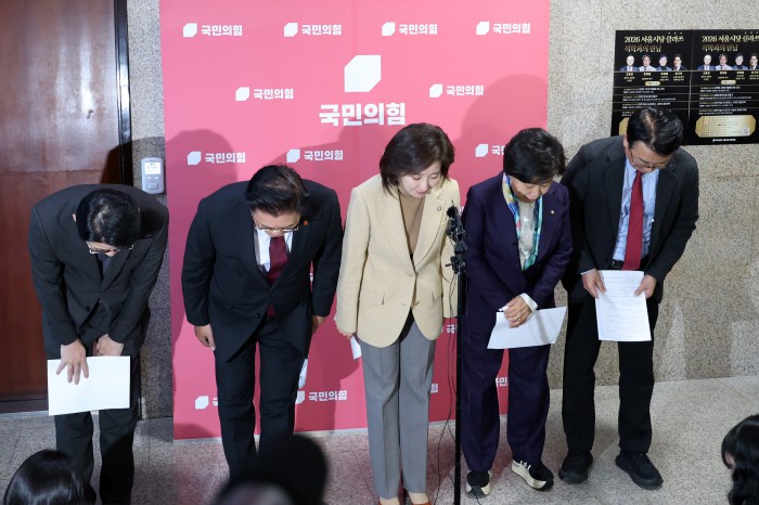 [서울=뉴스핌] 정일구 기자 = 국민의힘 나경원 의원을 비롯한 국민의힘 법제사법위원회 소속 의원들이 5일 오후 서울 여의도 국회에서 민주당의 일방적 법사위 회의 취소 통보를 규탄 기자회견을 하기 앞서 인사하고 있다. 2026.01.05 mironj19@newspim.com