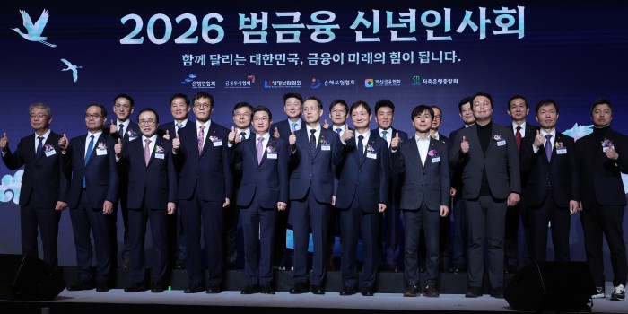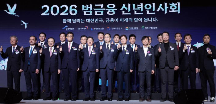 [서울=뉴스핌] 양윤모 기자 = 새해 금융업계의 현안과 비전을 공유하는 연례 행사인 '2026 범금융 신년인사회'가 5일 오후 서울 중구 소공동 롯데호텔에서 개최된 가운데 참석자들이 박수를 치고 있다. 행사에는 이형일 재정경제부 1차관,이억원 금융위원장,이찬진 금융감독원장,이창용 한국은행 총재 등 정부 인사, 국회 정무·기획재정위원회 의원, 5대 금융지주 회장, 은행·증권·보험·카드·저축은행 최고경영자(CEO) 등 약 400여 명이 참석했다. [공동취재] 2026.01.05 yym58@newspim.com