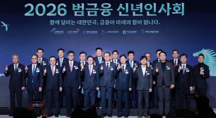 [서울=뉴스핌] 양윤모 기자 = 새해 금융업계의 현안과 비전을 공유하는 연례 행사인 '2026 범금융 신년인사회'가 5일 오후 서울 중구 소공동 롯데호텔에서 개최된 가운데 참석자들이 기념촬영을 하고 있다. 행사에는 이형일 재정경제부 1차관,이억원 금융위원장,이찬진 금융감독원장,이창용 한국은행 총재 등 정부 인사, 국회 정무·기획재정위원회 의원, 함영주 하나긍융회장등 5대 금융지주 회장, 은행·증권·보험·카드·저축은행 최고경영자(CEO) 등 약 400여 명이 참석했다. [공동취재] 2026.01.05 yym58@newspim.com