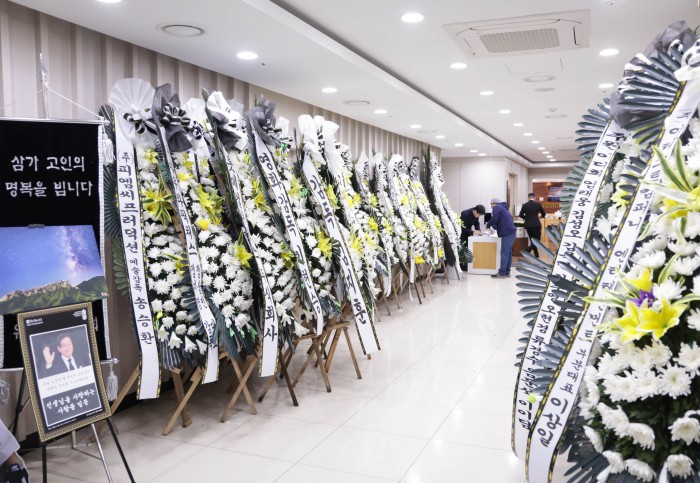 [서울=뉴스핌] 사진공동취재단 = 5일 고(故) 안성기 배우의 빈소가 마련된 서울성모병원 장례식장에 근조화환이 놓여 있다. 지난 2019년 혈액암 진단을 받은 후 1년 만에 완치 판정을 받았지만, 추적 관찰 과정에서 암이 재발하면서 최근까지 치료에 전념해왔다. 향년 74세. 2026.01.05 photo@newspim.com