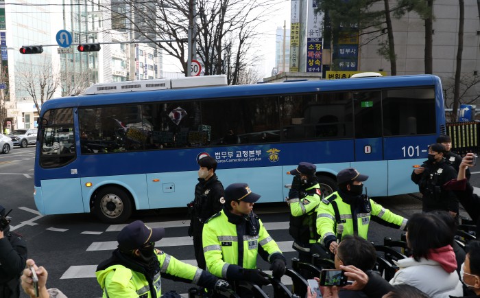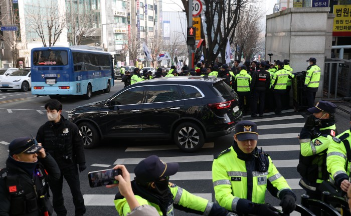 [서울=뉴스핌] 정일구 기자 = 윤석열 전 대통령의 체포방해 등 혐의 사건에 대한 1심 선고기일인 16일 오후 서울 서초구 서울중앙지방법원에서 윤 전 대통령이 탄 것으로 추정되는 호송차량이 법원을 나서고 있다. 서울중앙지법 형사합의35부(부장판사 백대현)는 이날 특수공무집행방해 등의 혐의로 기소된 윤 전 대통령에게 징역 5년을 선고했다. 2026.01.16 mironj19@newspim.com