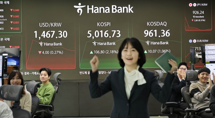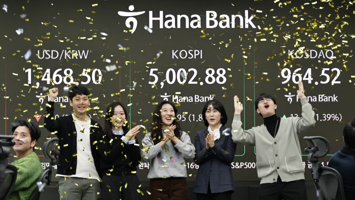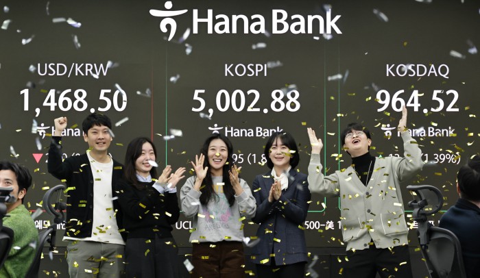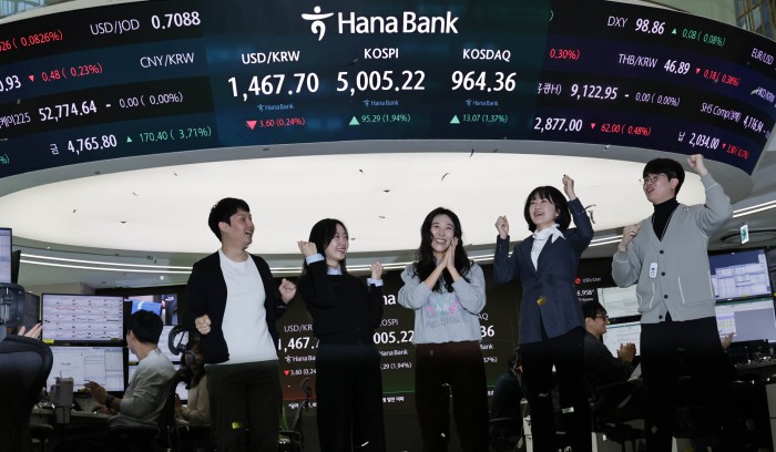 [서울=뉴스핌] 양윤모 기자 = 22일 오전 코스피가 5000 을 돌파하자 서울 중구 하나은행본점 딜링룸에서 직원들이 환호하고 있다. 2026.01.22 yym58@newspim.com
