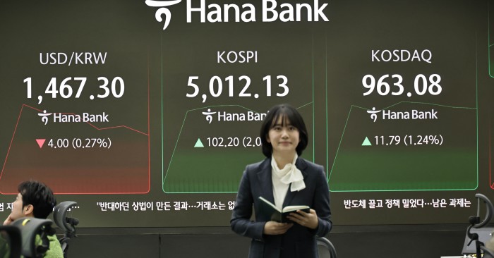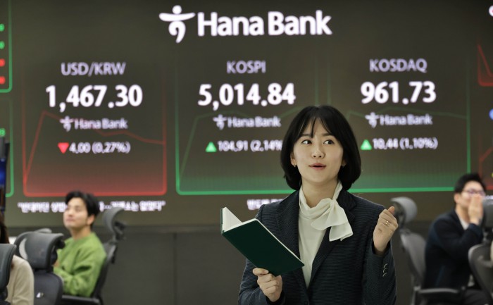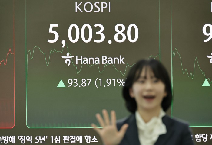 [서울=뉴스핌] 양윤모 기자 = 22일 오전 코스피가 5000 을 돌파하자 서울 중구 하나은행본점 딜링룸에서 직원이 손가락 다섯개를 펼쳐 보이고 있다.
