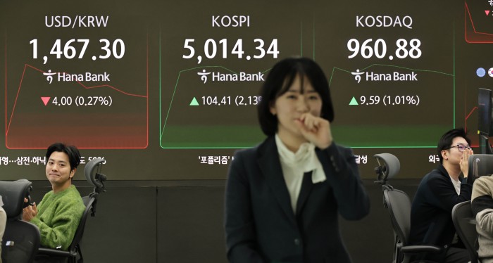 [서울=뉴스핌] 양윤모 기자 = 22일 오전 코스피가 전장 종가보다 104.41 포인트(2.13%) 상승하며 5014.34로, 코스닥은 9.59 포인트(1.01%) 상승한 960.88로 장을 시작한 가운데, 서울 중구 하나은행본점 딜링룸에서 직원들이 업무를 보고 있다.