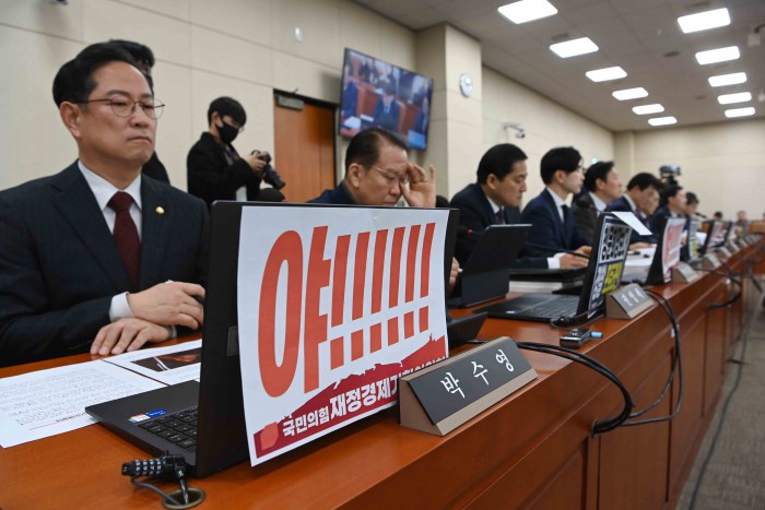 [서울=뉴스핌] 윤창빈 기자 = 23일 오전 서울 여의도 국회 재정경제기획위원회에서 열린 이혜훈 기획예산처 장관 후보자 인사청문회에 피켓이 부착돼 있다. 2026.01.23 pangbin@newspim.com