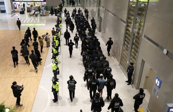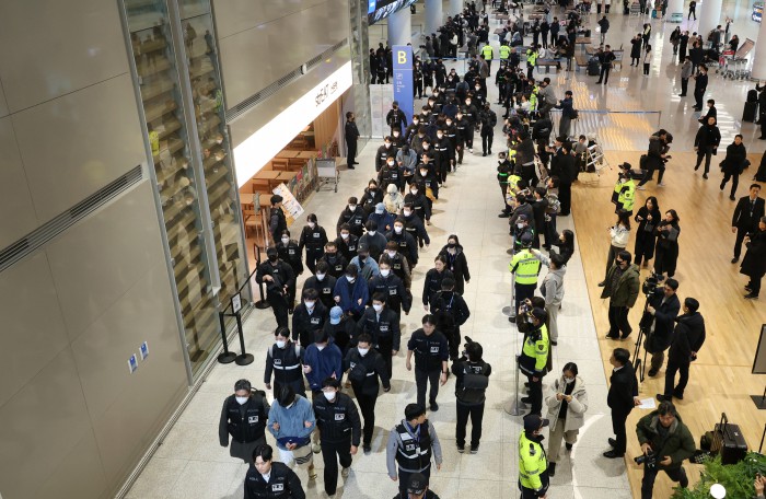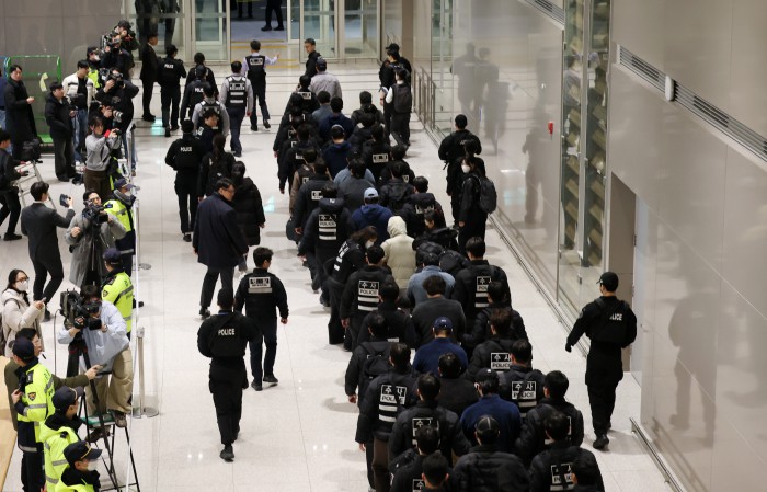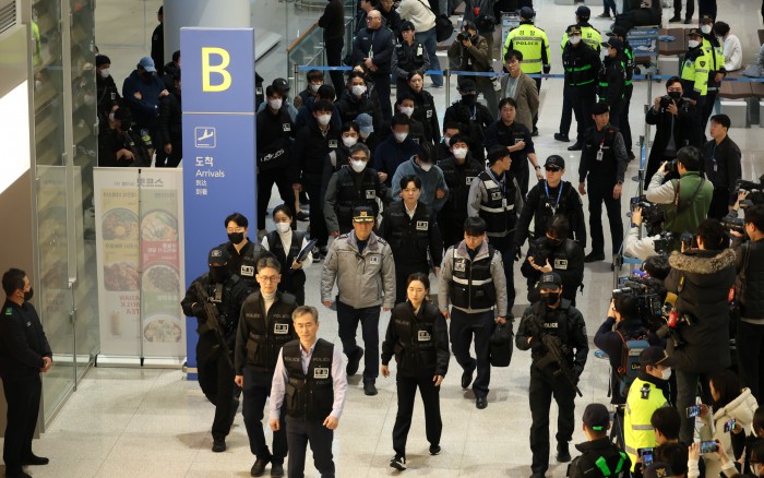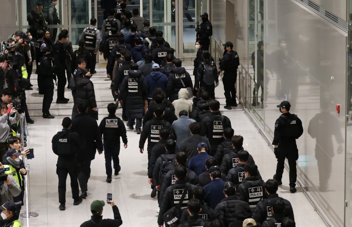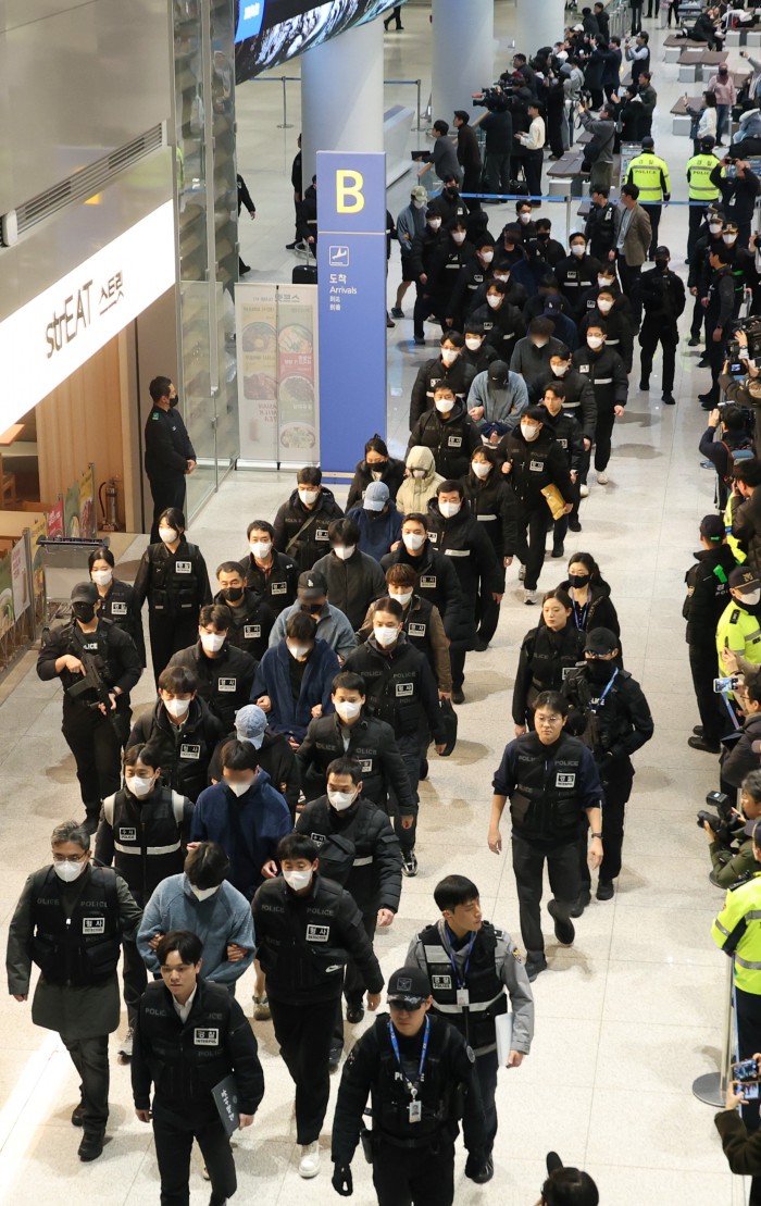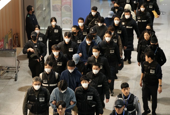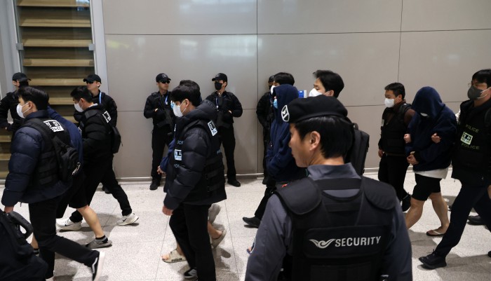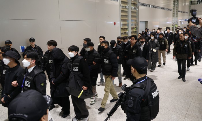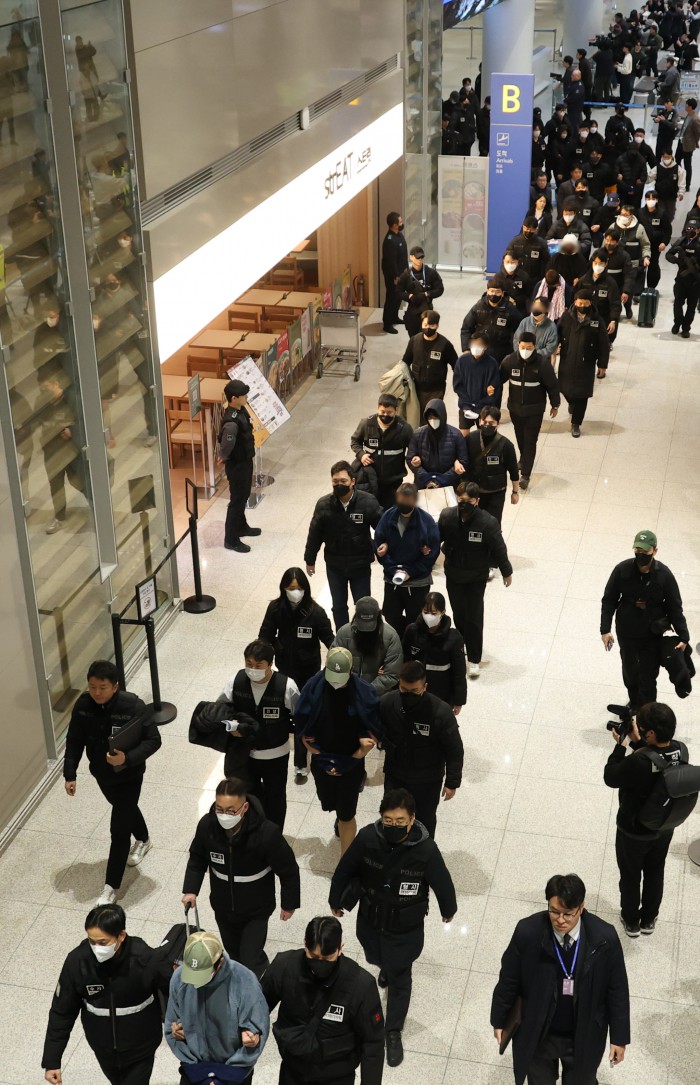 [영종도=뉴스핌] 정일구 기자 = 딥페이크 기술을 이용해 120억원을 가로챈 '로맨스 스캠 부부사기단' 등 캄보디아에서 각종 범행을 저지른 한국인 범죄 피의자 73명이 23일 오전 인천국제공항 제2여객터미널을 통해 송환되고 있다. 2026.01.23 mironj19@newspim.com