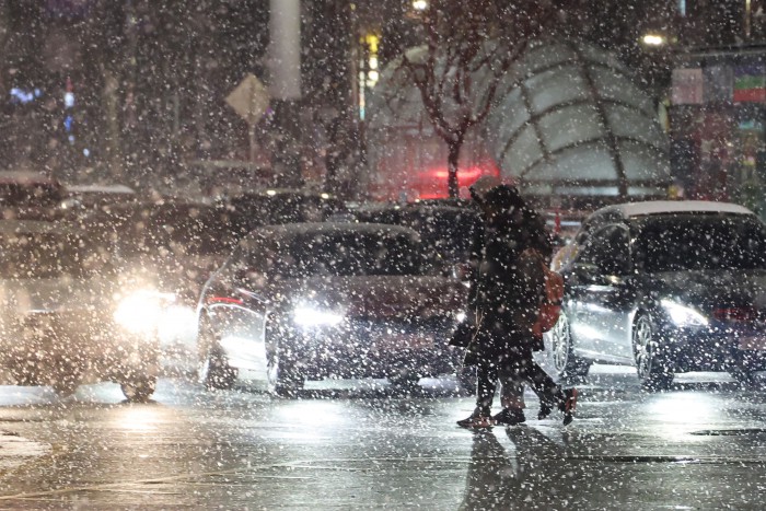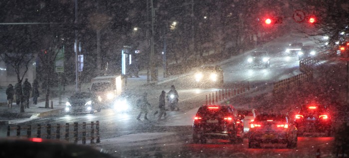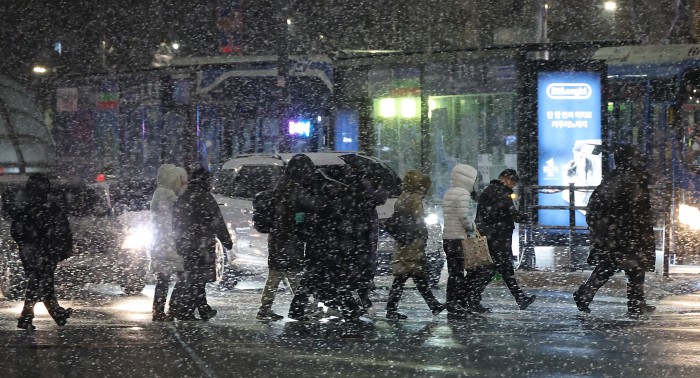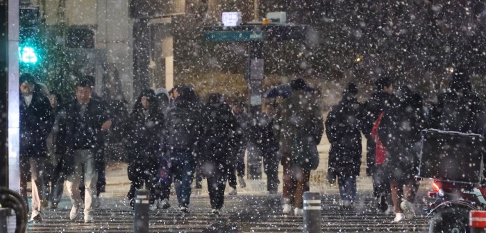 [서울=뉴스핌] 이형석 기자 = 23일 밤 서울 마포구 공덕역 인근에서 시민들이 내리는 눈을 맞으며 발걸음을 재촉하고 있다. 2026.01.23 leehs@newspim.com