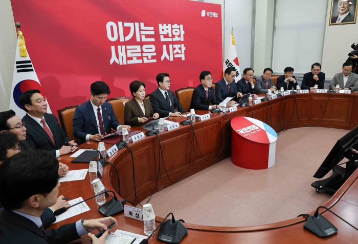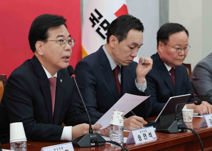 [서울=뉴스핌] 윤창빈 기자 = 송언석 국민의힘 원내대표가 26일 서울 여의도 국회에서 열린 최고위원회의에 참석하고 있다. 2026.01.26 pangbin@newspim.com