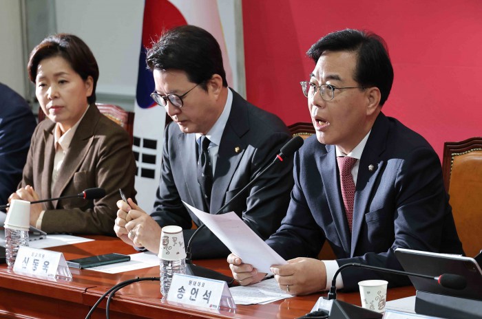 [서울=뉴스핌] 윤창빈 기자 = 송언석 국민의힘 원내대표가 26일 서울 여의도 국회에서 열린 최고위원회의에서 모두발언을 하고 있다. 2026.01.26 pangbin@newspim.com