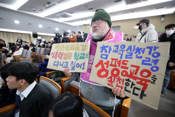 [서울=뉴스핌] 정일구 기자 = 정근식 서울시교육감이 26일 오전 서울 중구 서울시청 서소문별관 후생동에서 열린 제11회 서울특별시 학생인권의 날 기념식에서 복직 투쟁 중인 중학교 교사 지혜복 씨의 항의를 받고 있다. 2026.01.26 mironj19@newspim.com