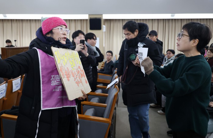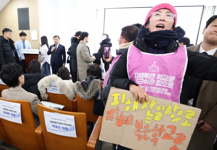 [서울=뉴스핌] 정일구 기자 = 복직 투쟁 중인 중학교 교사 지혜복 씨가 26일 오전 서울 중구 시청 서소문청사에서 열린 제11회 학생인권의 날 기념식에서 행사 참석자와 언쟁을 벌이고 있다. 2026.01.26 mironj19@newspim.com