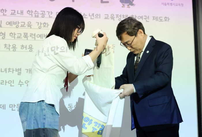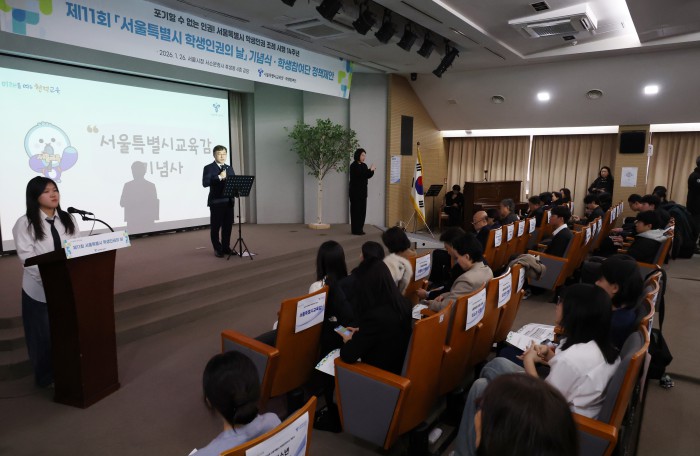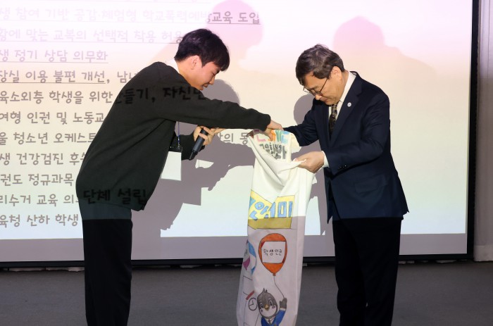 [서울=뉴스핌] 정일구 기자 = 정근식 서울시교육감이 26일 오전 서울 중구 서울시청 서소문별관 후생동에서 열린 제11회 서울특별시 학생인권의 날 기념식에서 학생참여단의 정책 제안을 받고 있다. 2026.01.26 mironj19@newspim.com