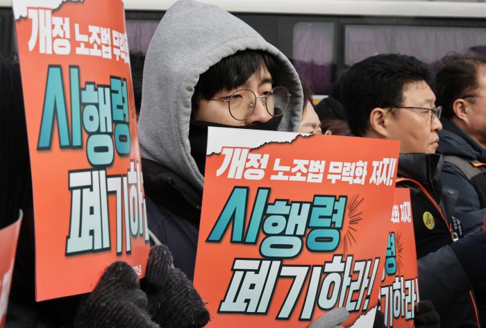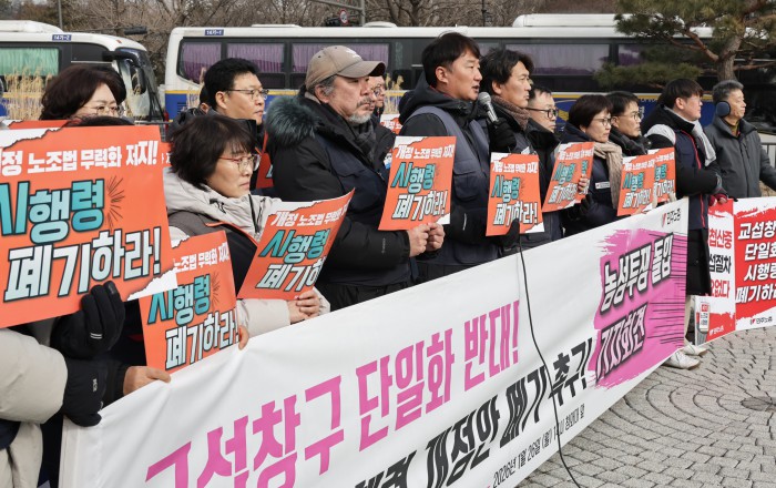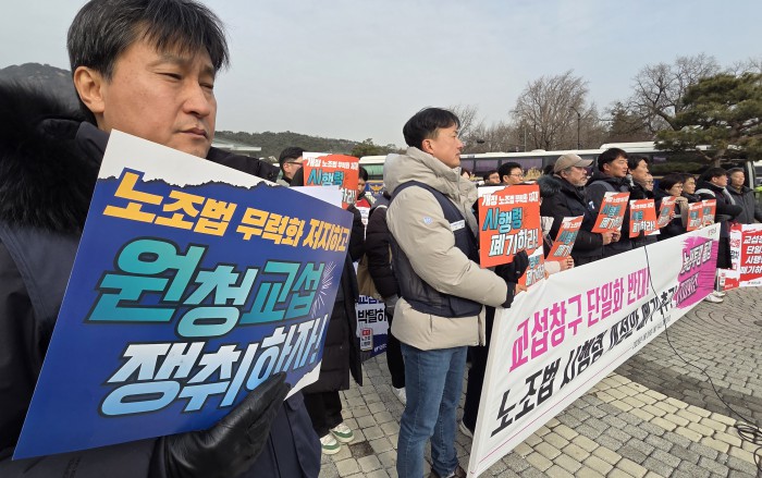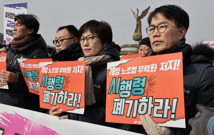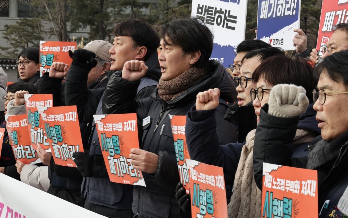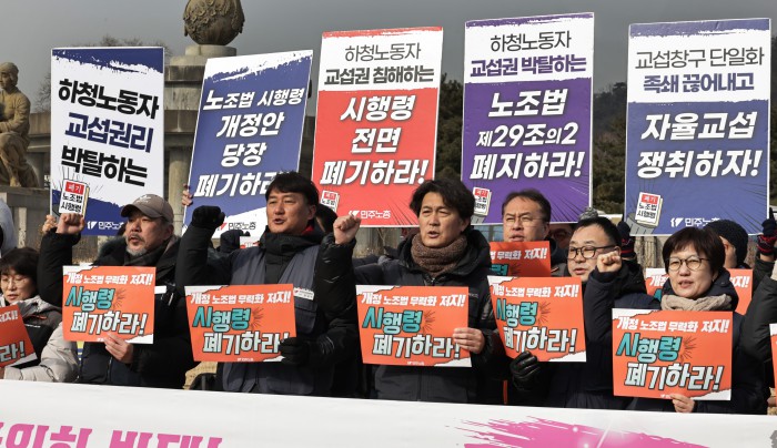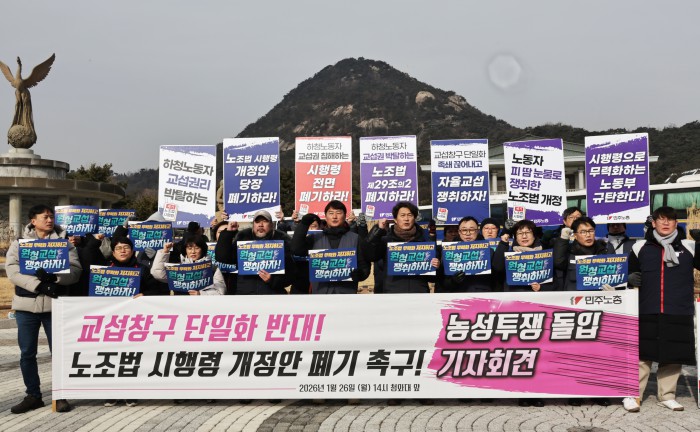 [서울=뉴스핌] 양윤모 기자 = 민주노총 조합원들이 26일 오후 서울 종로구 청와대 앞에서 교섭창구 단일화 반대와 노조법 시행령 개정안 폐기를 촉구하는 농성투쟁 돌입 기자회견을 개최했다.