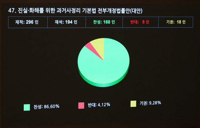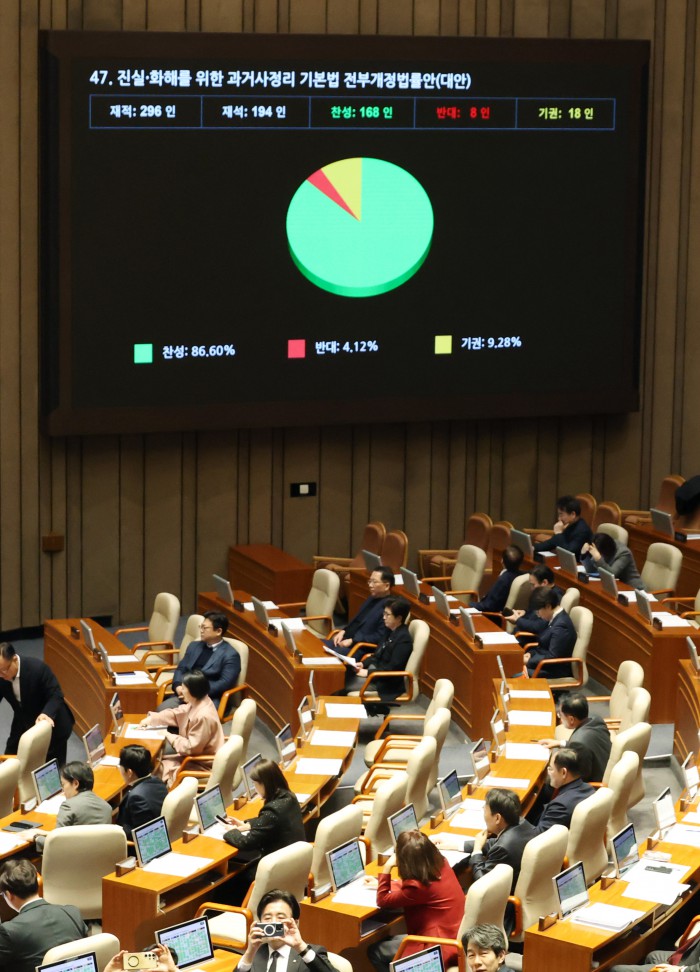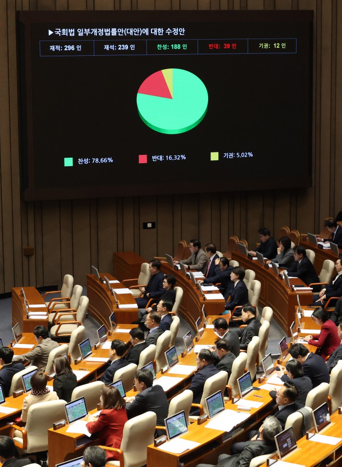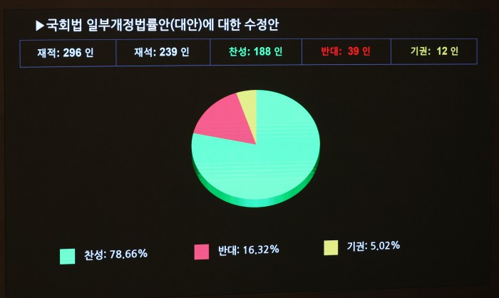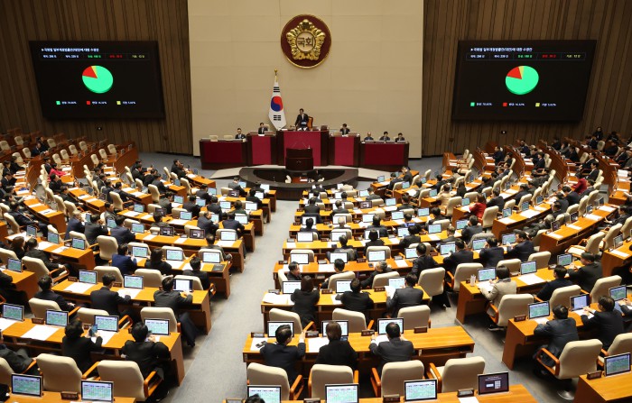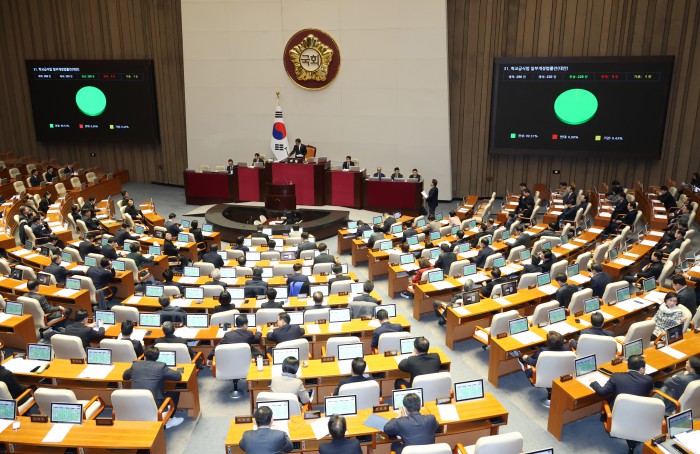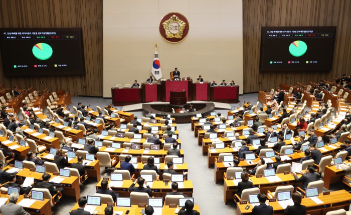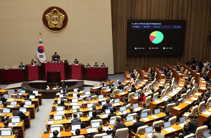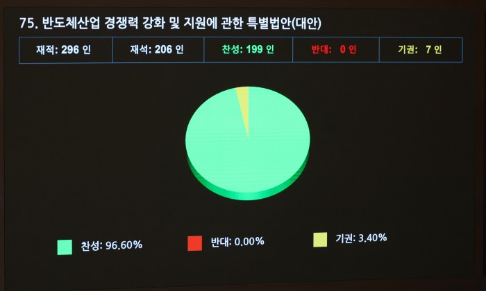 [서울=뉴스핌] 정일구 기자 = 29일 오후 서울 여의도 국회에서 열린 본회의에서 반도체산업 경쟁력 강화 및 지원에 관한 특별법안(대안)이 가결되고 있다. 2026.01.29 mironj19@newspim.com
