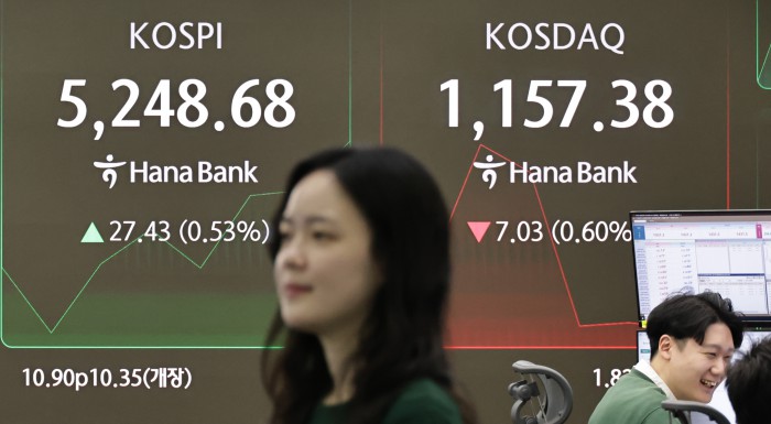 [서울=뉴스핌] 양윤모 기자 = 30일 오전 코스닥이 전장 종가보다 7.37 포인트(0.63%) 하락한 1157.04로, 코스피는 전장 종가보다 27.43 포인트(0.53%) 상승하며 5248.68로 장을 시작한 가운데, 서울 중구 하나은행본점 딜링룸에서 직원들이 업무를 보고 있다.