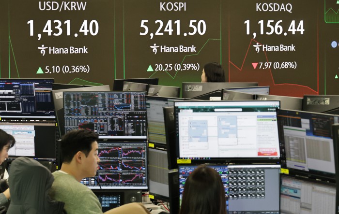 [서울=뉴스핌] 양윤모 기자 = 30일 오전 코스피가 전장 종가보다 20.25 포인트(0.39%) 상승하며 5241.50으로, 코스닥은 7.97 포인트(0.68%) 하락한 1156.44로 장을 시작한 가운데, 서울 중구 하나은행본점 딜링룸에서 직원들이 업무를 보고 있다.
