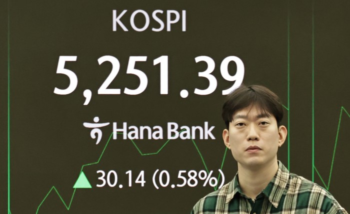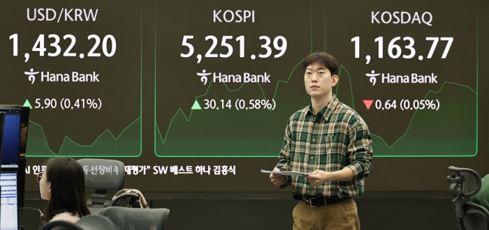 [서울=뉴스핌] 양윤모 기자 = 30일 오전 코스피가 전장 종가보다 27.43 포인트(0.53%) 상승하며 5248.68로, 코스닥은 7.03 포인트(0.60%) 하락한 1157.38로 장을 시작한 가운데, 서울 중구 하나은행본점 딜링룸에서 직원들이 업무를 보고 있다.