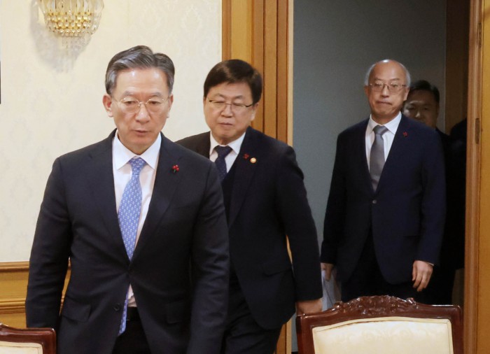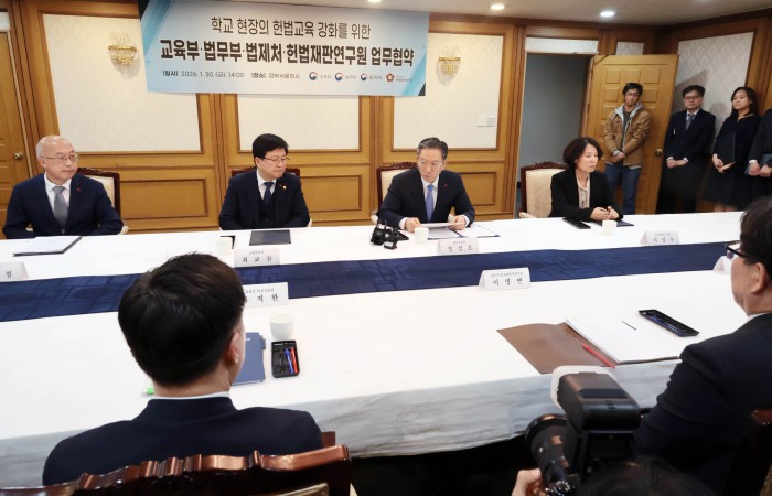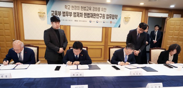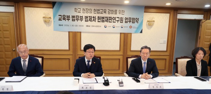 [서울=뉴스핌] 이길동 기자 =정성호 법무부 장관(왼쪽부터), 최교진 교육부 장관, 조원철 법제처장이 30일 서울 종로구 정부서울청사에서 열린 학교 현장의 헌법교육 강화를 위한 교육부·법무부·법제처·헌법재한연구원 업무협약식에 참석하고 있다. 2026.01.30gdlee@newspim.com