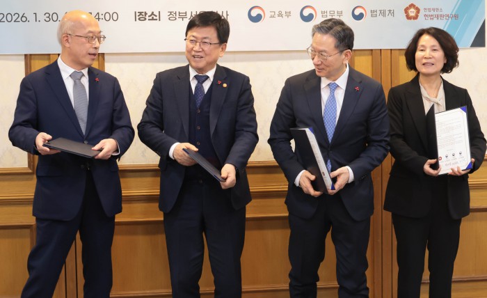[서울=뉴스핌] 이길동 기자 = 30일 서울 종로구 정부서울청사에서 열린 학교 현장의 헌법교육 강화를 위한 교육부·법무부·법제처·헌법재한연구원 업무협약식에서 조원철 법제처장(왼쪽부터), 최교진 교육부 장관, 정성호 법무부 장관, 지성수 헌법재판연구원장이 업무협약서에 서명을 마친 후 기념촬영을 하고 있다. 2026.01.30gdlee@newspim.com