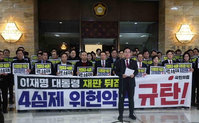[서울=뉴스핌] 윤창빈 기자 = 송언석 국민의힘 원내대표 등 소속 의원들이 12일 서울 여의도 국회 로텐더홀에서 열린 4심제 위헌악법 규탄대회에서 구호를 외치고 있다. 2026.02.12 pangbin@newspim.com