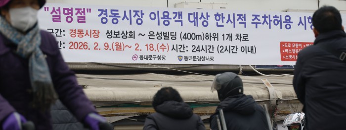 [서울=뉴스핌] 류기찬 기자 = 설 연휴를 사흘 앞둔 13일 오전 서울 동대문구 경동시장에 한시적 주차허용 안내 현수막이 붙어있다. 2026.02.13 ryuchan0925@newspim.com