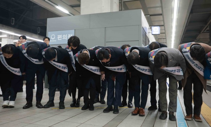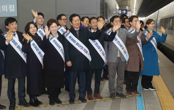 [서울=뉴스핌] 윤창빈 기자 = 더불어민주당 정청래 대표와 한병도 원내대표 등 최고위원들이 13일 서울 용산구 용산역에서 설 명절 귀성 인사를 하고 있다. 2026.02.13 pangbin@newspim.com
