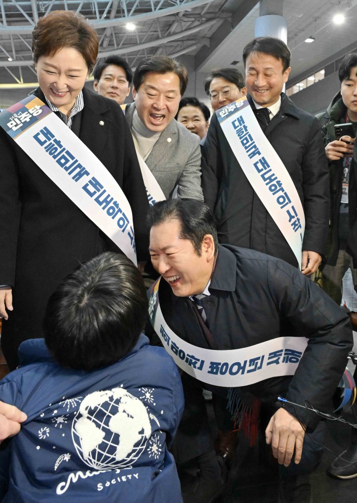 [서울=뉴스핌] 윤창빈 기자 = 정청래 더불어민주당 대표와 한병도 원내대표 등 당 지도부가 13일 서울 용산역에 귀성인사차 방문해 어린이와 인사를 하고 있다. 2026.02.13 pangbin@newspim.com