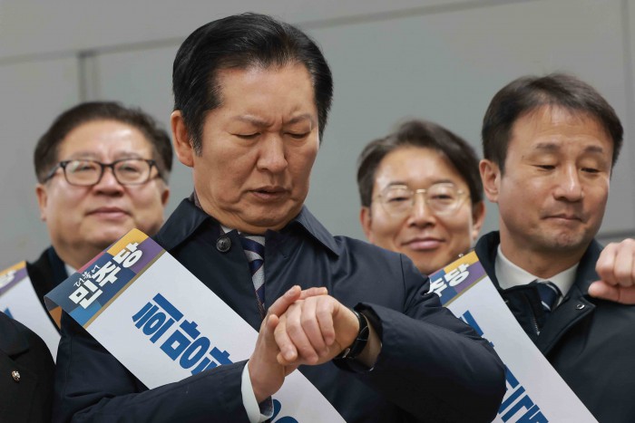 [서울=뉴스핌] 윤창빈 기자 = 정청래 더불어민주당 대표가 13일 서울 용산역에 귀성 인사차 방문해 시간을 확인하고 있다. 2026.02.13 pangbin@newspim.com