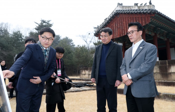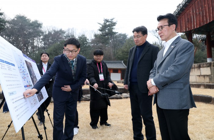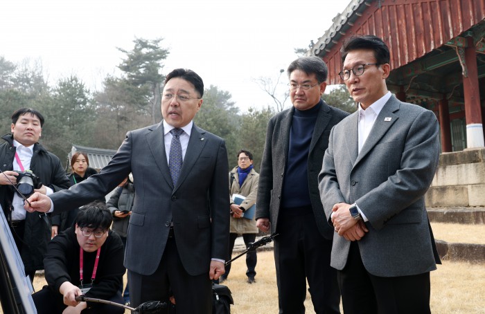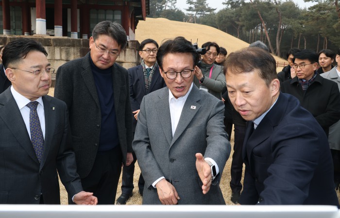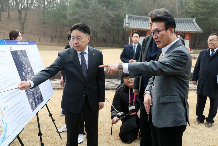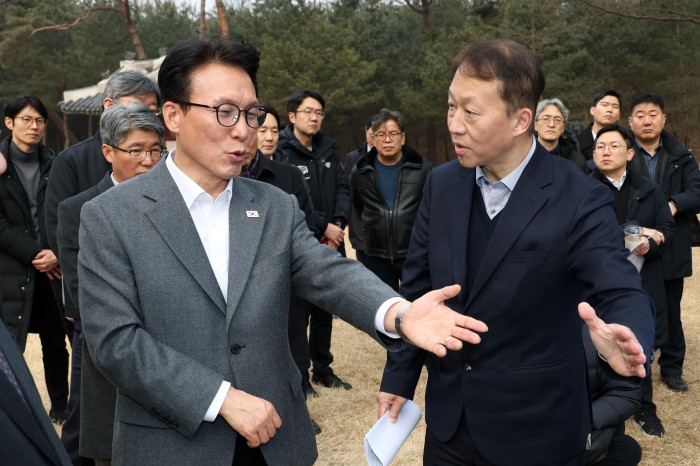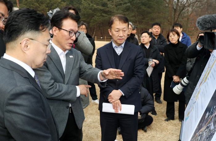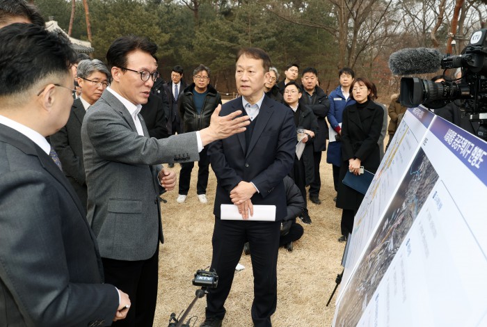 [서울=뉴스핌] 정일구 기자 = 김민석 국무총리가 13일 오후 1.29 도심주택공급방안 관련 태릉CC 현장점검을 위해 서울 노원구 강릉을 방문해 박동선 LH 국토도시본부장으로부터 태릉 부지 현황 보고를 받고 있다. 2026.02.13 mironj19@newspim.com